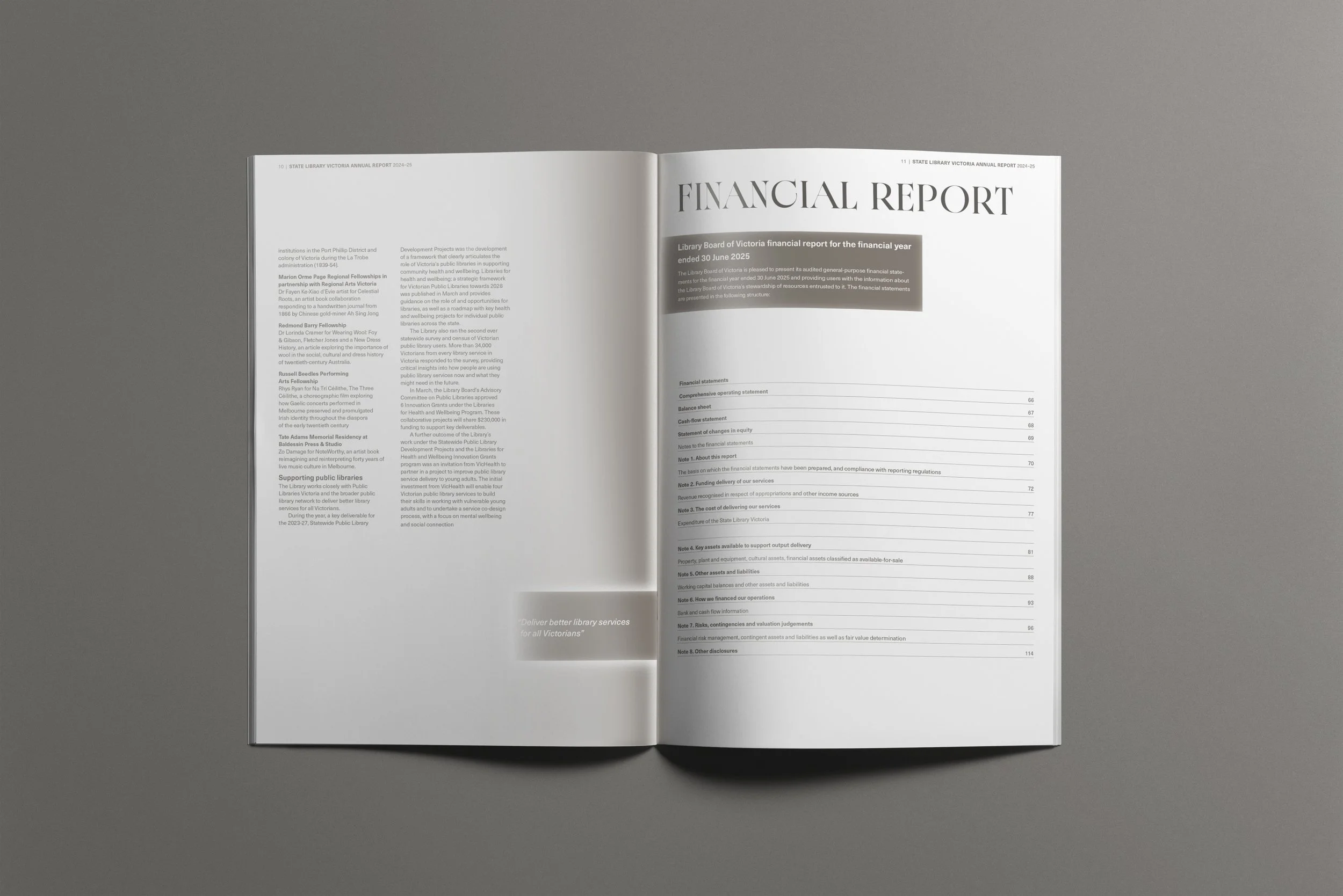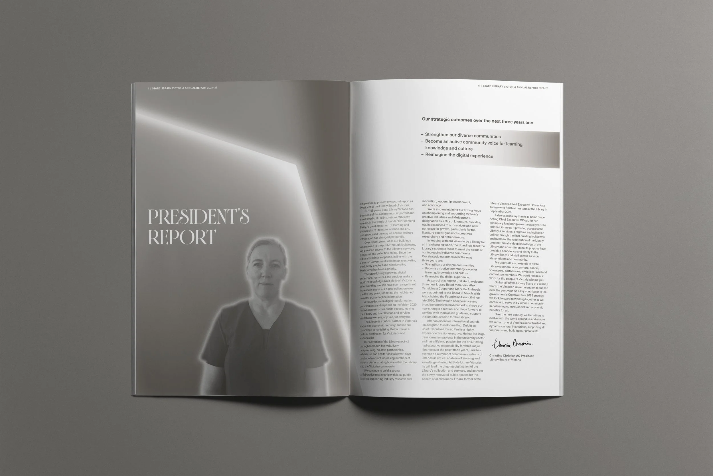 Create a conceptual annual report for the State Library of Victoria that reflects its vision and values, balancing innovative visual storytelling with clarity and technical accuracy.
